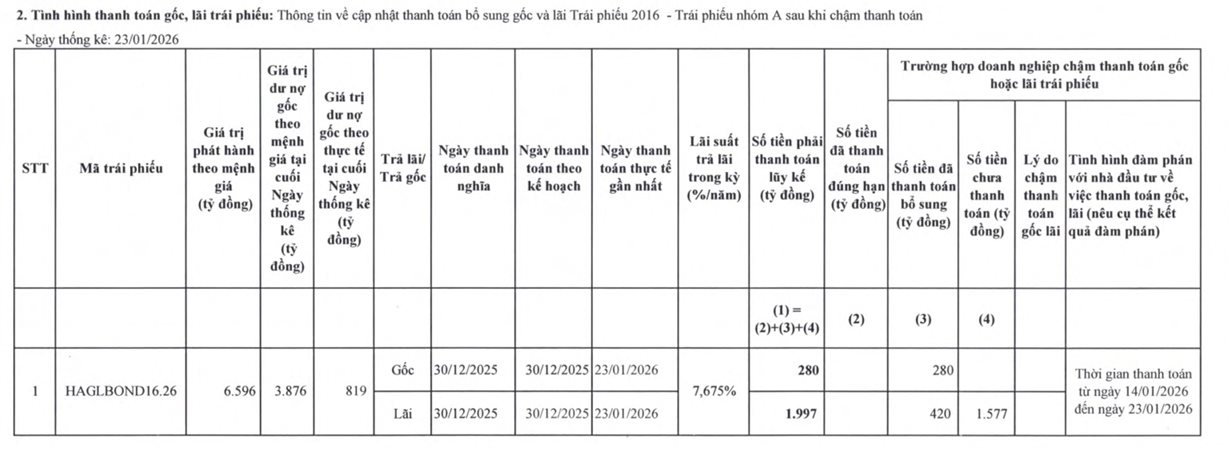Đây là động thái xử lý nợ dứt khoát của HAGL đối với lô trái phiếu có kỳ hạn thanh toán theo kế hoạch là ngày 30/12/2025. Việc thanh toán thực tế được thực hiện trễ khoảng 3 tuần so với danh nghĩa, với lý do được doanh nghiệp đưa ra là cần thời gian đàm phán với nhà đầu tư.