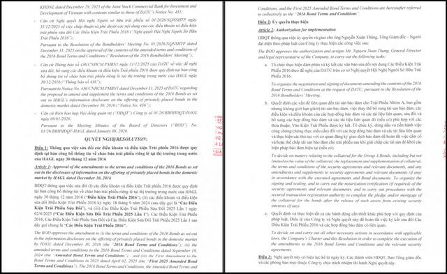 Cụ thể, ngày 8/1/2026, HĐQT CTCP Hoàng Anh Gia Lai đã thôngqua việc sửa đổi các điều khoản và điều kiện của Trái phiếu 2016.