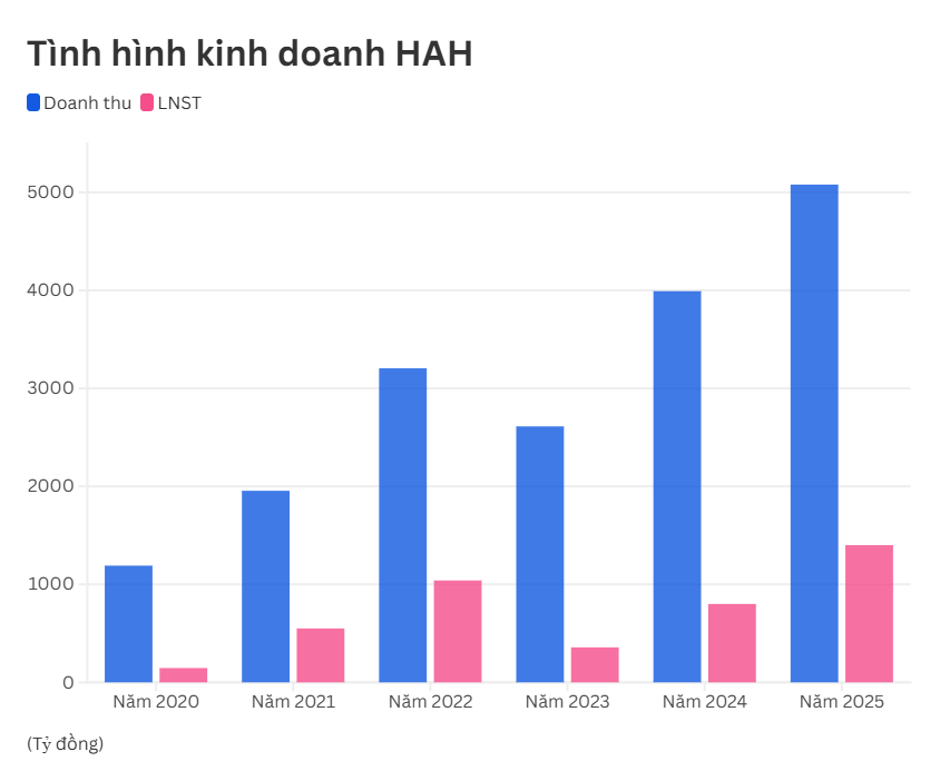 Trong khi đó, tại ngày cuối năm 2025, vốn chủ sở hữu của HAH đạt hơn 5.394 tỷ đồng, tăng gần 1.400 tỷ đồng so với thời điểm đầu năm nay, trong đó khoản lợi nhuận chưa phân phối hơn 1.319 tỷ đồng.
