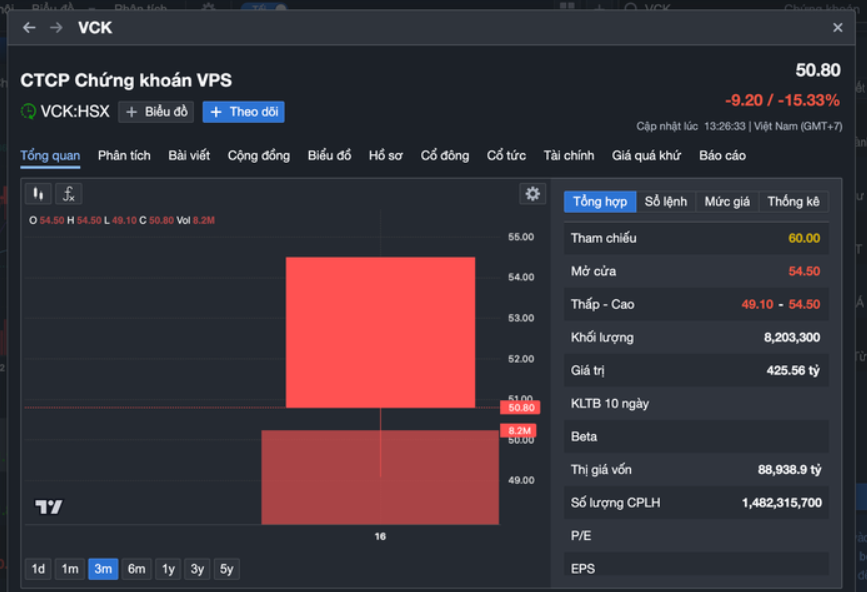 Sáng 16-12, Sở Giao dịch Chứng khoán TPHCM (HOSE) đã tổ chức Lễ trao quyết định niêm yết cho Công ty CP Chứng khoán VPS, chính thức đưa hơn 1,48 tỉ cổ phiếu VCK vào giao dịch trên sàn HOSE, với giá tham chiếu 60.000 đồng/cổ phiếu trong ngày giao dịch đầu tiên. Biên độ giá cổ phiếu VCK trong ngày giao dịch đầu tiên là 20%.