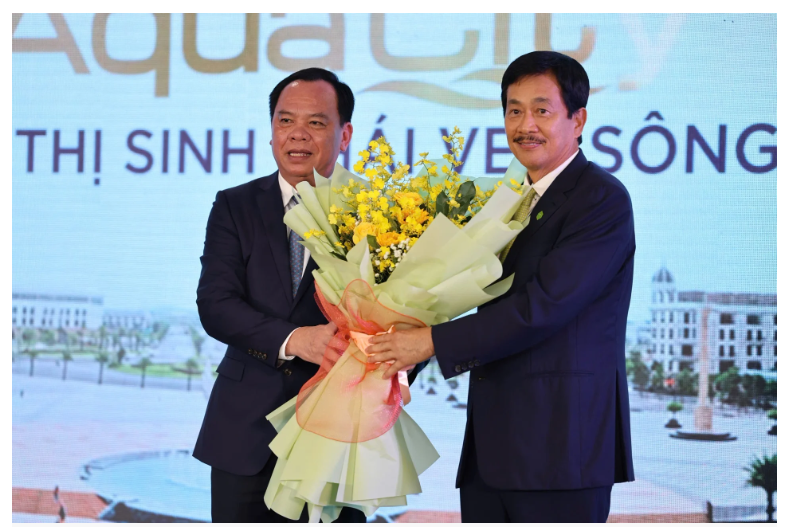 Ông Bùi Thành Nhơn, Chủ tịch HĐQT Tập đoàn Novaland tặng hoa tri ân lãnh đạo tỉnh Đồng Nai đã đồng hành tháo gỡ pháp lý cho dự án Aqua City.