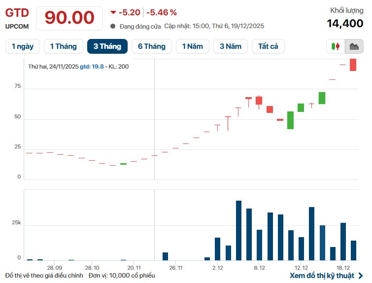 Trên thị trường UPCoM, giá cổ phiếu GTD tăng mạnh, giai đoạn từ 19/11 đến 4/12, mã này ghi nhận chuỗi 12 phiên tăng trần liên tiếp. Ba phiên liền trước ngày 19/12 đều đóng cửa tại giá trần và kết phiên 19/12, cổ phiếu này có giá 90.000 đồng/cp.