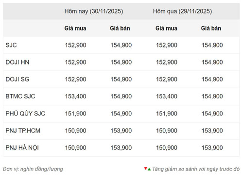 Cụ thể, tại thời điểm 17 giờ chiều 30/10, Công ty Vàng bạc đá quý Sài Gòn (SJC) niêm yết giá vàng miếng SJC mua vào-bán ra ở mức 152,9-154,9 triệu đồng/lượng, tăng 4,5 triệu đồng so tuần trước. Chênh lệch mua-bán 3 triệu đồng/lượng.