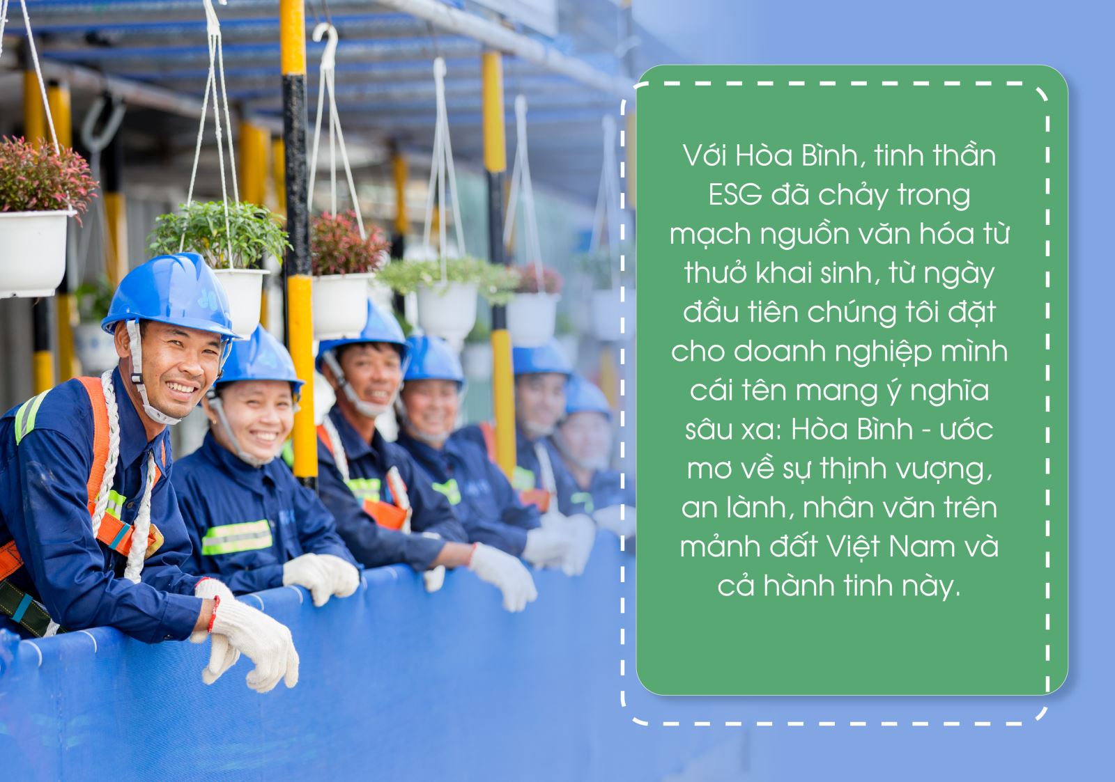 Với Hòa Bình, tinh thần ESG đã chảy trong mạch nguồn văn hóa từ thưở khai sinh, từ ngày đầu tiên chúng tôi đặt cho doanh nghiệp mình cái tên mang ý nghĩa sâu xa: Hòa Bình - ước mơ về sự thịnh vượng, an lành, nhân văn trên mảnh đất Việt Nam và cả hành tinh này.