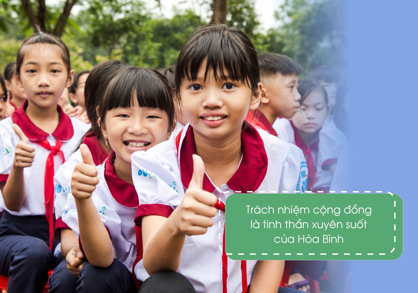 Trước khi ESG trở thành một khung báo cáo với những chỉ số và tiêu chuẩn đo lường cụ thể, Hòa Bình đã luôn coi trách nhiệm với xã hội và cộng đồng là một phần không thể tách rời trong sứ mệnh của mình. Chúng tôi tin rằng, một doanh nghiệp tồn tại giữa xã hội thì không thể chỉ biết đến lợi ích của riêng mình, mà phải biết lắng nghe, thấu hiểu và chia sẻ với cộng đồng đã và đang nuôi dưỡng sự lớn mạnh của doanh nghiệp ấy.