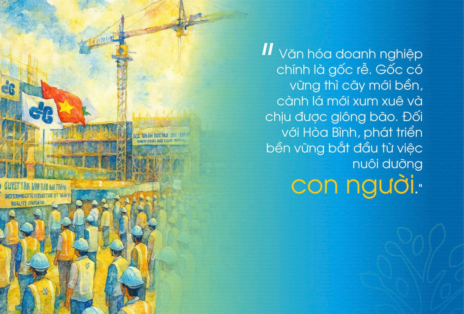 Không ồn ào hay phô trương, văn hóa thấm vào từng quyết định, từng hành vi, từng cách chúng ta làm việc và ứng xử với nhau mỗi ngày. Khi được xây dựng và nuôi dưỡng đúng cách, văn hóa trở thành nguồn lực vô hình nhưng mạnh mẽ. Chúng tôi đã từng bước vượt chông gai để vươn tới đỉnh vinh quang, giữ trọn niềm tin từ đối tác, khách hàng, hình thành một tập thể đồng hành, gắn bó, luôn sẵn sàng cùng nhau chinh phục đỉnh cao, đó là bản sắc riêng không thể sao chép, không thể xóa mờ. Từ những giá trị truyền thống ấy, Hòa Bình tiếp tục phát triển, tiếp cận những tiến bộ mới nhất, hướng đến ESG, xây dựng môi trường, công trường xanh bền vững.