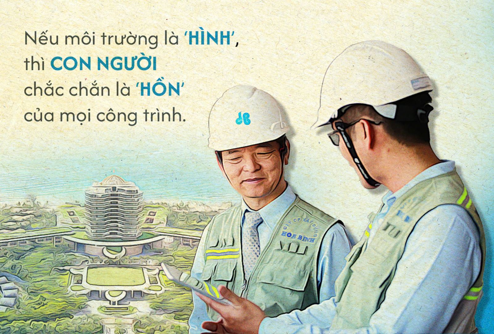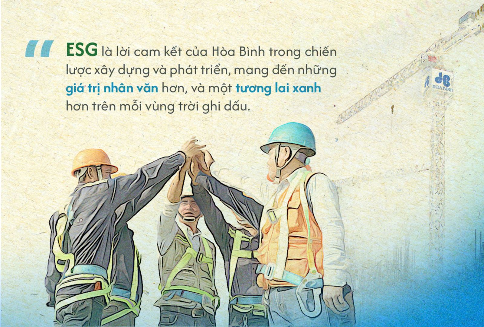 Hòa Bình đã trải qua không ít những gian lao, có lúc tưởng chừng khó khăn phủ kín như mây đen trước mắt. Nhưng chính trong những khoảnh khắc ấy, chúng tôi lại nhìn thấy rõ hơn một điều: chỉ cần còn giữ trong tim mình khát vọng, thì con đường tương lai sẽ vẫn rộng mở. Khát vọng ấy, từ thuở ban đầu đến hôm nay chưa từng thay đổi, đó là khát vọng đóng góp cho đất nước, cho nhân loại, cho một hành tinh xanh bền vững. Mỗi thay đổi dù nhỏ bé nhưng sẽ là nền tảng để tác động tạo lên những điều lớn lao. Hòa Bình có thể là một, nhưng hàng trăm công trình của Hòa Bình, hàng ngàn CBCNV đang ngày đêm cống hiến, tất cả sẽ cùng lan tỏa giá trị tốt đẹp. Đây không chỉ là vai trò mà còn là trách nhiệm của một doanh nghiệp trong hành trình xây dựng. ESG là lời hứa của Hòa Bình trong chiến lược xây dựng và phát triển, mang đến những giá trị nhân văn hơn, và một tương lai xanh hơn trên mỗi vùng trời ghi dấu.