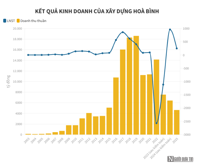 Lũy kế cả năm 2025, Hòa Bình ghi nhận doanh thu 4.634,6 tỷ đồng, giảm 27,8% so với năm 2024. Lợi nhuận sau thuế đạt 250 tỷ đồng, giảm tới 74%.