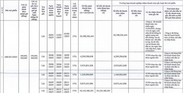 Tuy nhiên, tại ngày đáo hạn 31/10/2025, Xây dựng Hòa Bình đã chậm thanh toán số tiền gốc còn lại 12,4 tỷ đồng của lô trái phiếu nêu trên với lý do chưa thu xếp được nguồn tiền.