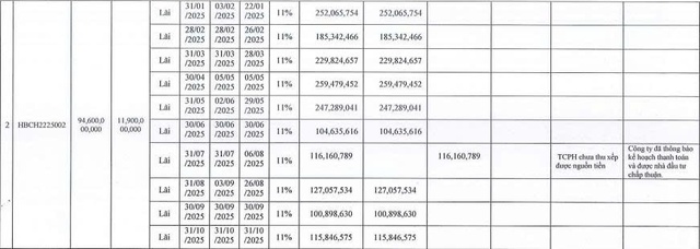 Đồng thời, Xây dựng Hòa Bình cũng đã thanh toán tổng cộng hơn 1,7 tỷ đồng cho lô trái phiếu mã HBCH2225002 trong năm 2025. Lô trái phiếu này có tổng giá trị phát hành 94,6 tỷ đồng, được phát hành ngày 31/10/2022, kỳ hạn 3 năm, dự kiến đáo hạn vào 31/10/2025.