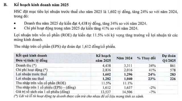 Trong năm 2025, HSC đặt mục tiêu doanh thu 4.438 tỷ đồng, tăng 34% so với năm 2024. Chi phí hoạt động của doanh nghiệp dự kiến tăng 41% trong năm 2025. Dù vậy, lợi nhuận trước thuế cả năm vẫn được kỳ vọng tăng 24% so với năm trước lên mức 1.602 tỷ đồng; lợi nhuận sau cũng dự kiến tăng 23% lên mức 1.282 tỷ đồng.