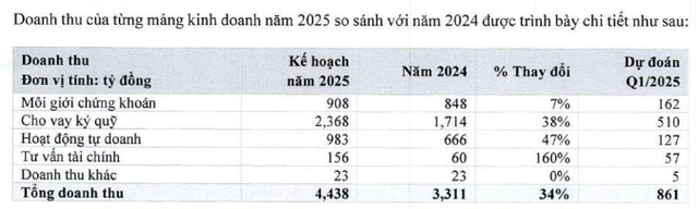 Đối với từng mảng kinh doanh, HSC kỳ vọng hoạt động cho vay ký quỹ đóng góp nhiều nhất vào doanh thu với mức 2.368 tỷ đồng, dự kiến tăng 38% so với năm 2024. Tiếp đến là hoạt động tự doanh dự kiến mang về 983 tỷ đồng và môi giới chứng khoán 908 tỷ đồng, lần lượt tăng 47% và 7% so với năm trước.