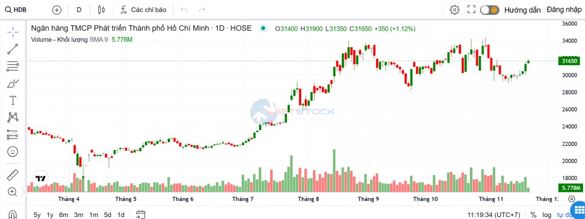 Trên thị trường chứng khoán, tạm chốt phiên giao dịch sáng 20/11, cổ phiếu HDB tăng lên 31.700 đồng, nhích thêm 400 đồng tương đương 1,28% so với cuối phiên trước đó. Đà tăng này diễn ra trong bối cảnh thanh khoản giảm mạnh, chỉ còn hơn 5,6 triệu đơn vị so với mức gần 21 triệu cổ phiếu khớp lệnh trong phiên 19/11.