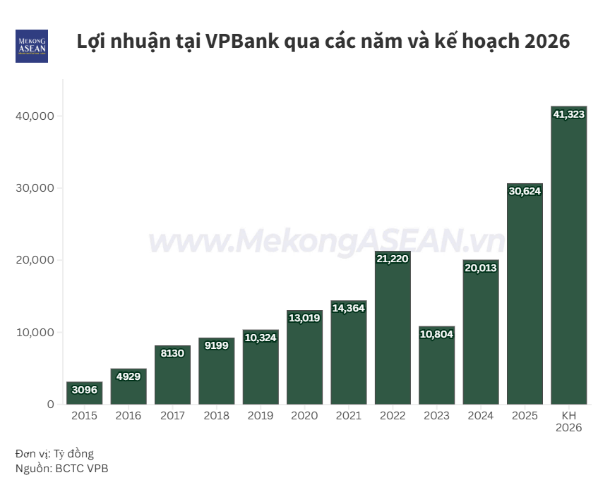Đối với ngân hàng mẹ, VPBank dự kiến kiểm soát tỷ lệ nợ xấu dưới 2,5% theo Thông tư 11 của Ngân hàng Nhà nước, đồng thời duy trì tốc độ tăng trưởng tín dụng và huy động vốn ở mức cao, qua đó tạo nền tảng cho mục tiêu lợi nhuận tăng trưởng hai chữ số trong năm 2026.