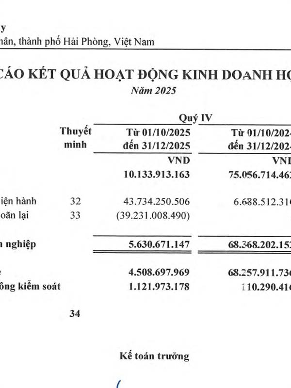 Công ty Cổ phần Đầu tư Dịch vụ Hoàng Huy giải trình chênh lệch KQKD quý 4/2025 so với cùng kỳ năm trước như sau: