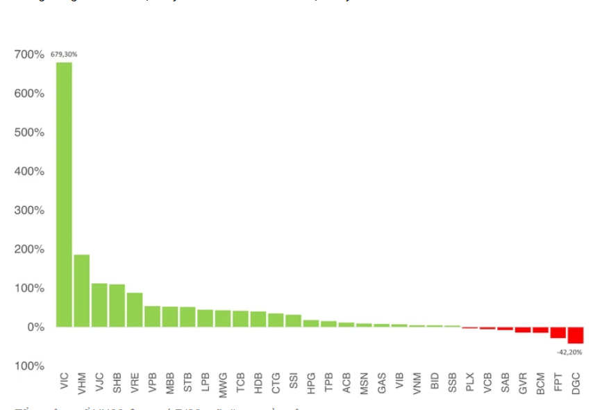 Tương phản lớn với các cổ phiếu trên là những vận động giá phi thường của nhóm cổ phiếu Vingroup. Dù vừa có phiên giảm sàn sau khi xuất hiện thông tin xin rút khỏi dự án đường sắt tốc độ cao Bắc - Nam, cổ phiếu VIC vẫn đang tăng gấp hơn 7,8 lần còn VHM tăng 2,8 lần và VRE tăng hơn 88% so với đầu năm.