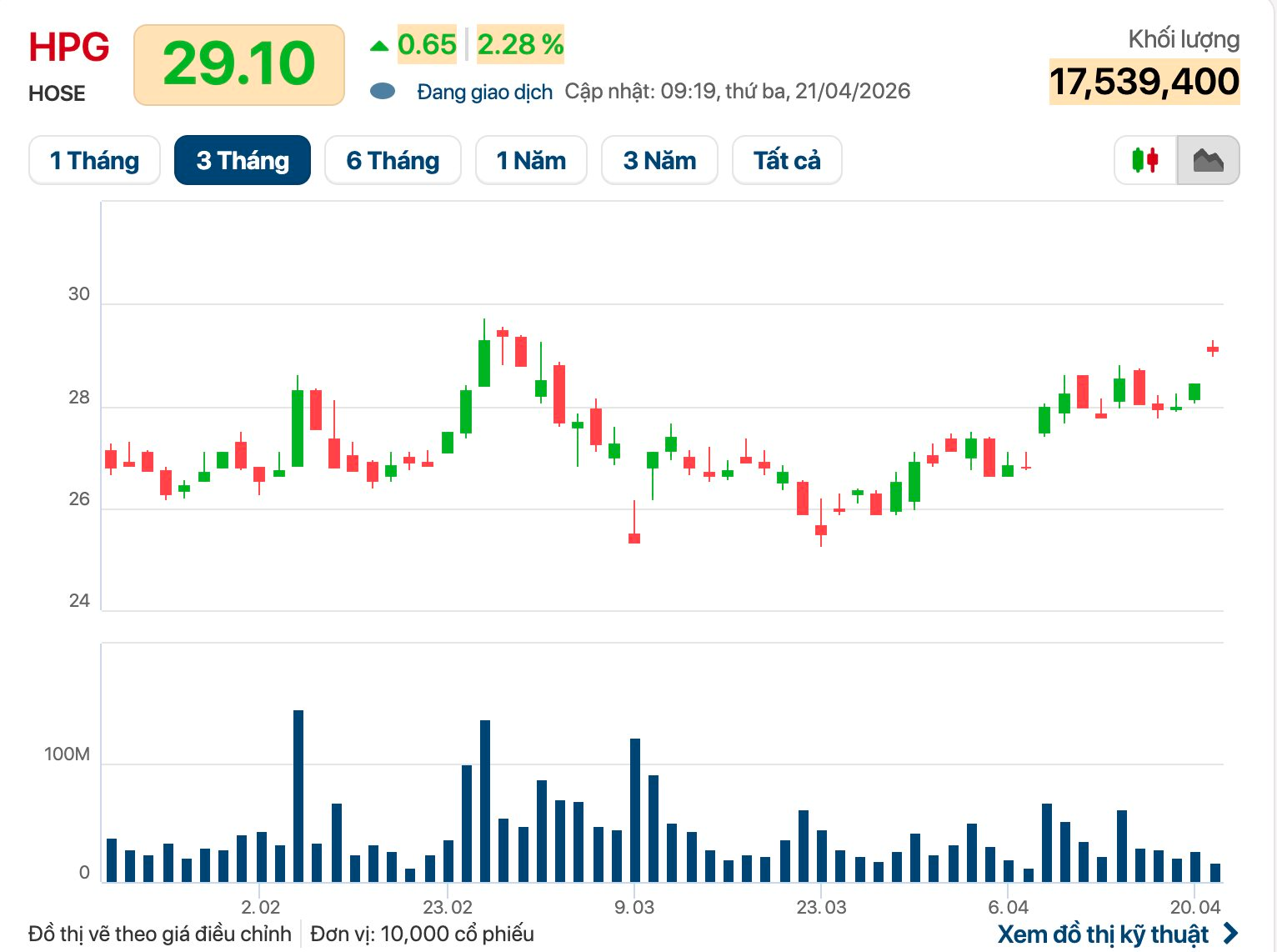 Trên thị trường chứng khoán, sáng 21/4, cổ phiếu HPG tăng 2,28% lên 29.100 đồng/cp, sau khoảng nhiều tháng giao dịch quanh vùng giá 26.000-28.000 đồng/cp.