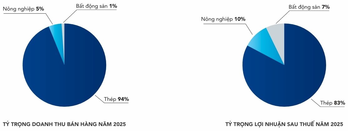 Trong cơ cấu hoạt động, lĩnh vực gang thép và các sản phẩm liên quan tiếp tục duy trì vai trò chủ đạo khi đóng góp 93% vào tổng doanh thu và chiếm khoảng 83% tổng lợi nhuận sau thuế.