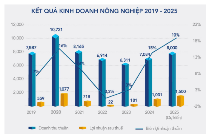 Năm 2025, Nông nghiệp Hoà Phát đặt mục tiêu doanh thu đạt 8.000 tỷ và lợi nhuận sau thuế 1.500 tỷ đồng, lần lượt tăng 28% và 16% so với thực hiện năm ngoái. Dù vậy, những con số này vẫn thấp hơn đáng kể so với mức kỷ lục từng đạt được vào năm 2020.