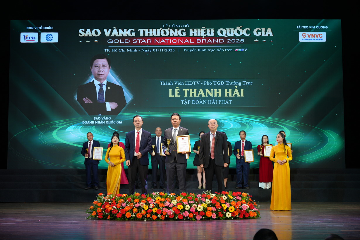 Ngày 1/11/2025, tại Nhà hát Bến Thành (TP. HCM), chương trình “Sao Vàng Thương Hiệu Quốc Gia 2025” do Viện Nghiên cứu Kinh tế Châu Á, Liên hiệp Khoa học Phát triển Doanh nghiệp Việt Nam và Đài Truyền hình TP. HCM phối hợp tổ chức đã vinh danh nhiều thương hiệu và doanh nhân tiêu biểu trên toàn quốc. Trong đó, doanh nhân Lê Thanh Hải, Thành viên Hội đồng Quản trị - Phó Tổng Giám đốc Thường trực Tập đoàn Hải Phát được vinh danh với danh hiệu “Sao Vàng Doanh nhân Quốc gia” – phần thưởng ghi nhận những đóng góp nổi bật của ông trong lĩnh vực bất động sản và quản trị doanh nghiệp.