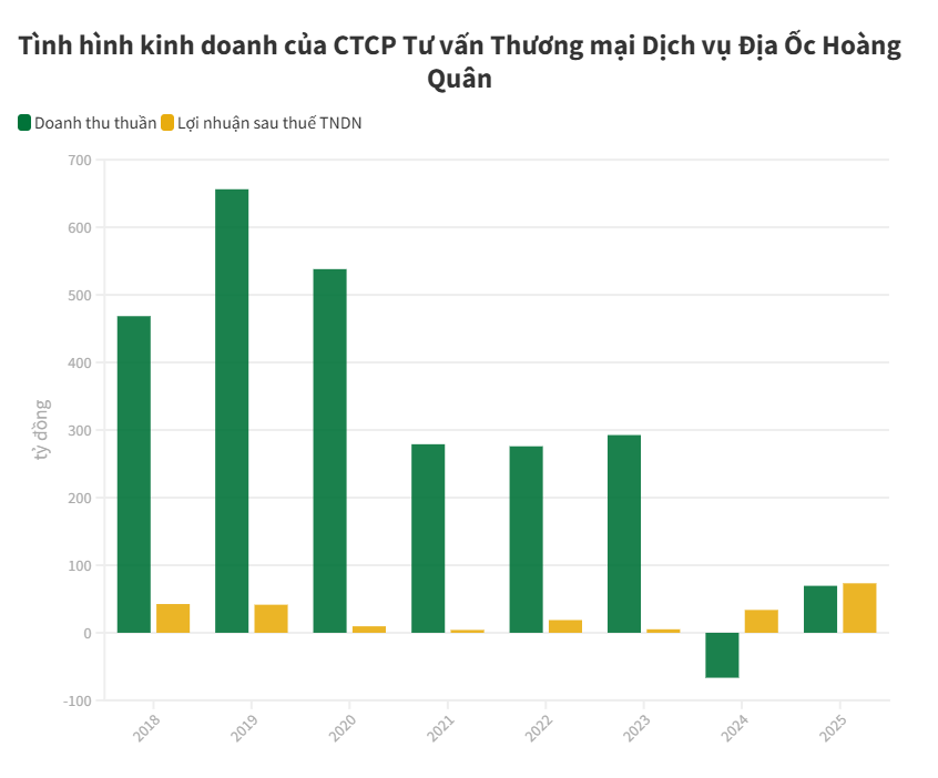 Lũy kế cả năm 2025, Hoàng Quân ghi nhận doanh thu thuần đạt khoảng 69,5 tỷ đồng, trong khi năm 2024 ghi nhận doanh thu âm do các khoản giảm trừ lớn.