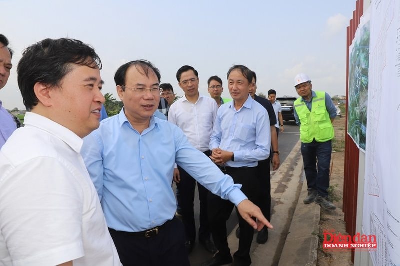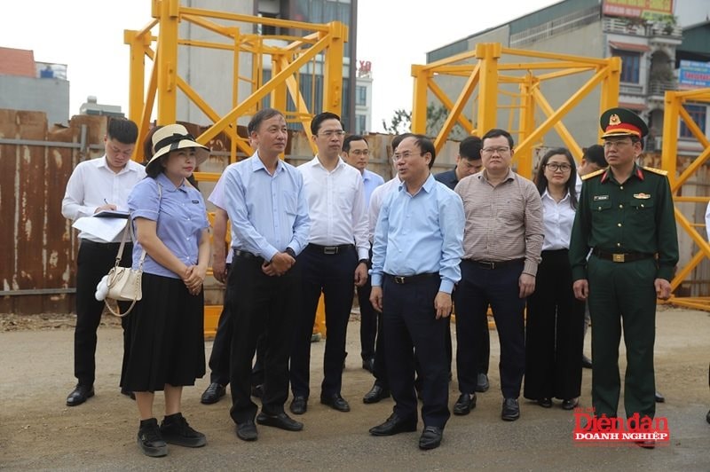 Lãnh đạo Bộ Xây dựng, UBND tỉnh Hưng Yên và các đại biểu kiểm tra tiến độ triển khai các dự án nhà ở xã hội trên địa bàn tỉnh (Ảnh: T.Đ)