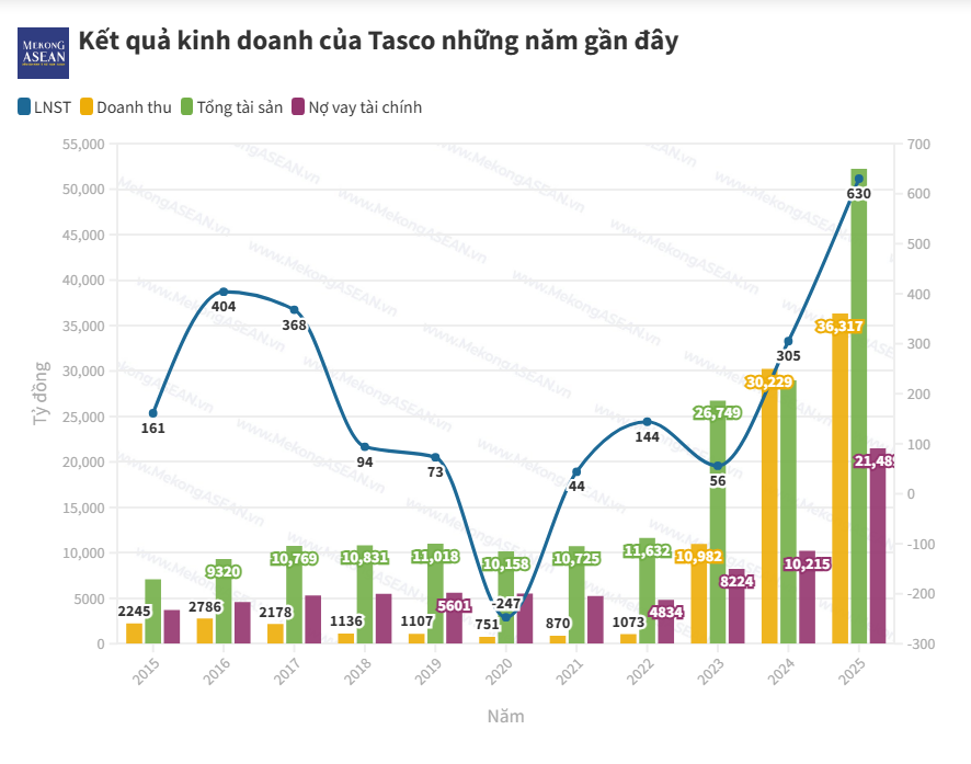 Nếu hoàn thành các chỉ tiêu này, Tasco sẽ tiếp tục duy trì đà tăng trưởng mạnh từ năm 2025. Cụ thể, doanh thu hợp nhất năm 2025 đạt 36.380 tỷ đồng, tăng 20% so với năm 2024. Lợi nhuận sau thuế hợp nhất đạt 630 tỷ đồng, gấp đôi năm 2024 và vượt kế hoạch đề ra. Trường hợp loại trừ tác động từ phân bổ lợi thế thương mại và giá trị đánh giá lại tài sản, lợi nhuận sau thuế năm 2025 đạt 993 tỷ đồng.