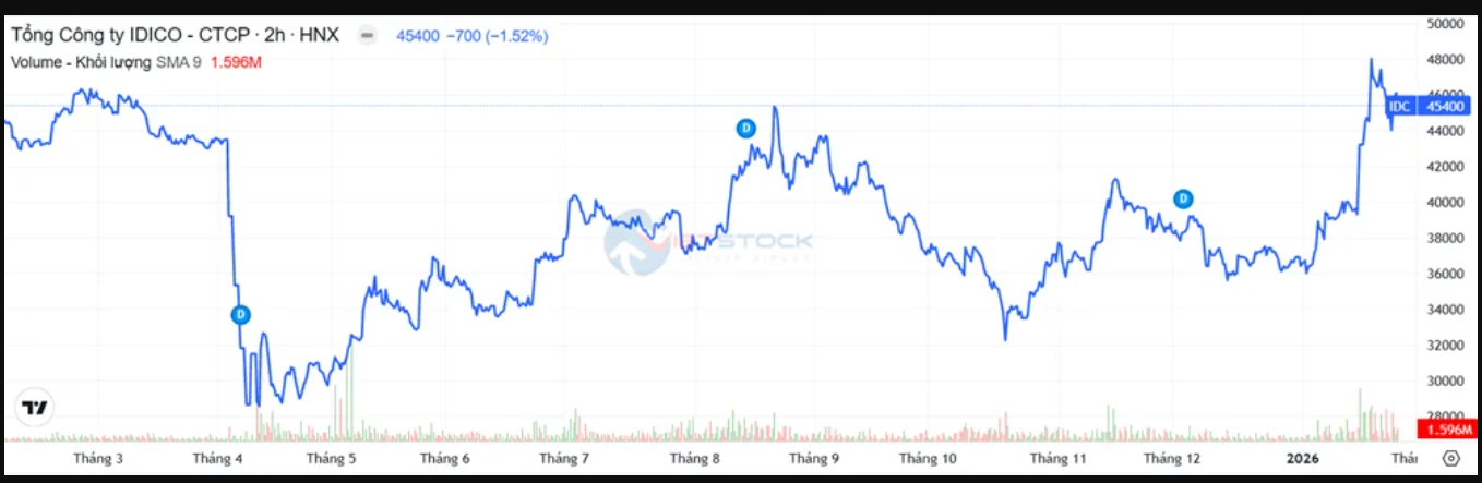 Cổ phiếu IDICO là một trong những cổ phiếu bị ảnh hưởng nặng nề bởi chính sách thuế quan gây sốc của Tổng thống Mỹ Donald Trump vào tháng 4, lao dốc từ vùng 45.600 đồng/cp xuống 31.000 đồng/cp. Sau 9 tháng, trải qua nhiều con sóng, hiện nay, cổ phiếu IDC cũng đã vượt vùng giá trước biến cố thuế quan để lên 47.400 đồng/cp và hiện có sự điều chỉnh về vùng 45.400 đồng/cp (chốt phiên 27/1), đà tăng mạnh lên nhanh chóng trong đầu năm 2026.