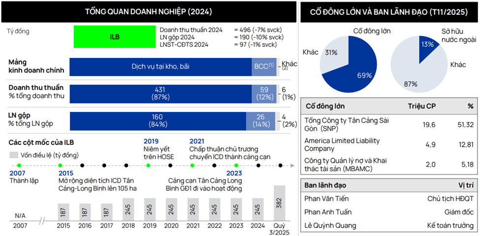 ILB là thành viên của Tổng công ty Tân Cảng Sài Gòn (SNP) – đơn vị hàng đầu về khai thác cảng, dịch vụ biển và logistics với 51,32% cổ phần. Khai thác kho bãi hiện tại vẫn là dịch vụ cốt lõi của ILB, trong khi mảng khai thác cảng và logistics đang được mở rộng mạnh mẽ, hướng tới trở thành trụ cột tăng trưởng thứ hai của công ty.