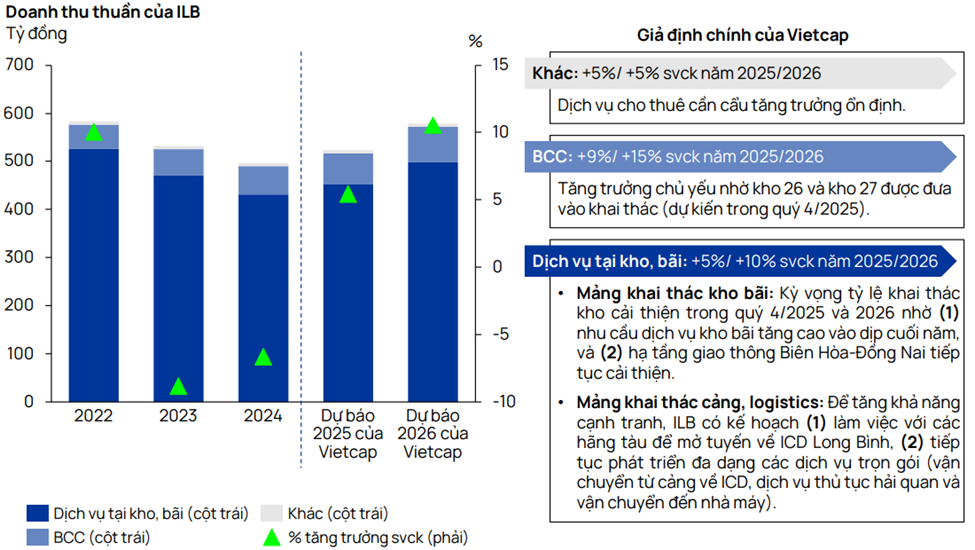 Năm 2025/2026, VCSC dự báo doanh thu thuần tăng 5%/11% svck, nhờ nhu cầu kho bãi tiếp tục phục hồi và các kho mới đi vào hoạt động, trong khi mảng cảng & logistics duy trì đà mở rộng.