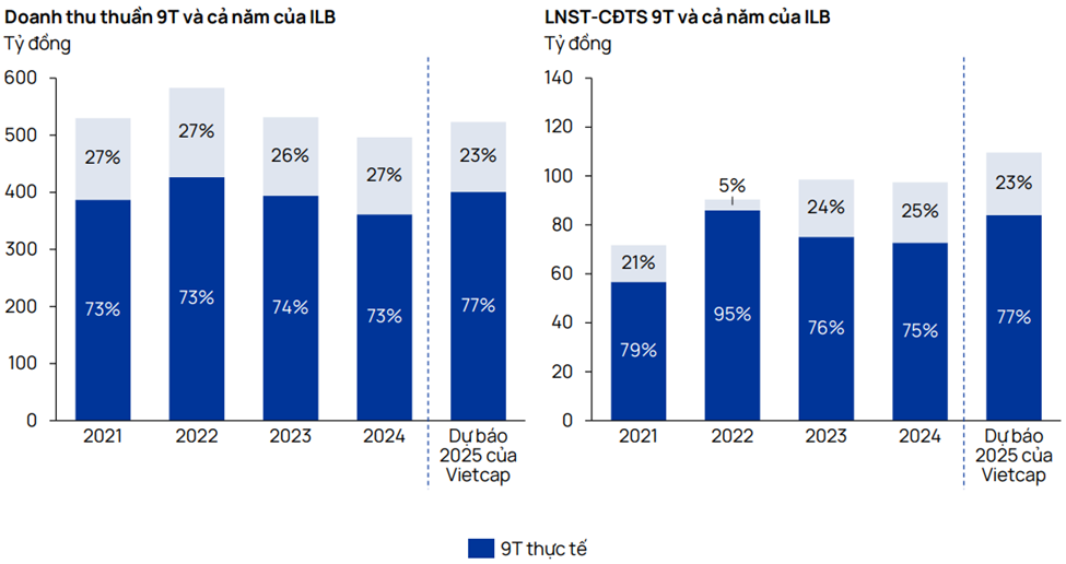Quý 4 thường là mùa cao điểm của ILB. 9T 2025, ILB đã hoàn thành 77%/77% dự báo doanh thu thuần/LNST-CĐTS của VCSC.