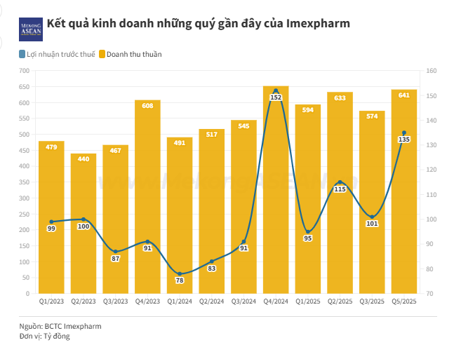 Năm 2025, doanh nghiệp đặt mục tiêu doanh thu thuần 2.649 tỷ đồng và lợi nhuận trước thuế 493,5 tỷ đồng. Như vậy, Imexpharm hoàn thành khoảng 92% kế hoạch doanh thu và 90% mục tiêu lợi nhuận trước thuế.
