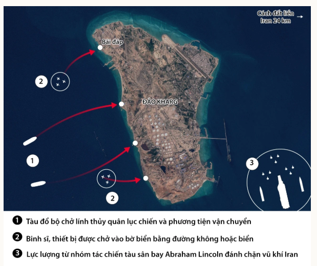 Cách lực lượng Mỹ có thể đổ bộ lên đảo Kharg. Đồ họa: Telegraph