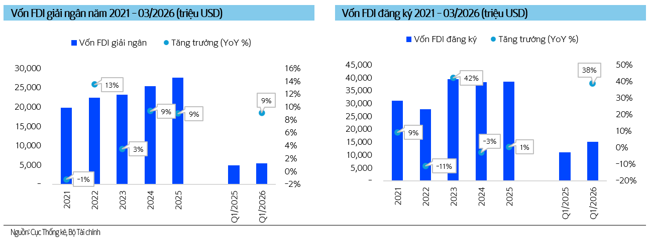 Theo Cục Thống kê, lũy kế đến tháng 03/2026, dòng vốn FDI tiếp tục ghi nhận diễn biến tích cực, trong đó vốn FDI thực hiện đạt 5.41 tỷ USD (+9.1% YoY), trong khi tổng vốn đăng ký đạt 15.2 tỷ USD (+42.9% YoY).