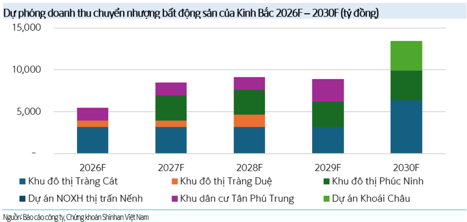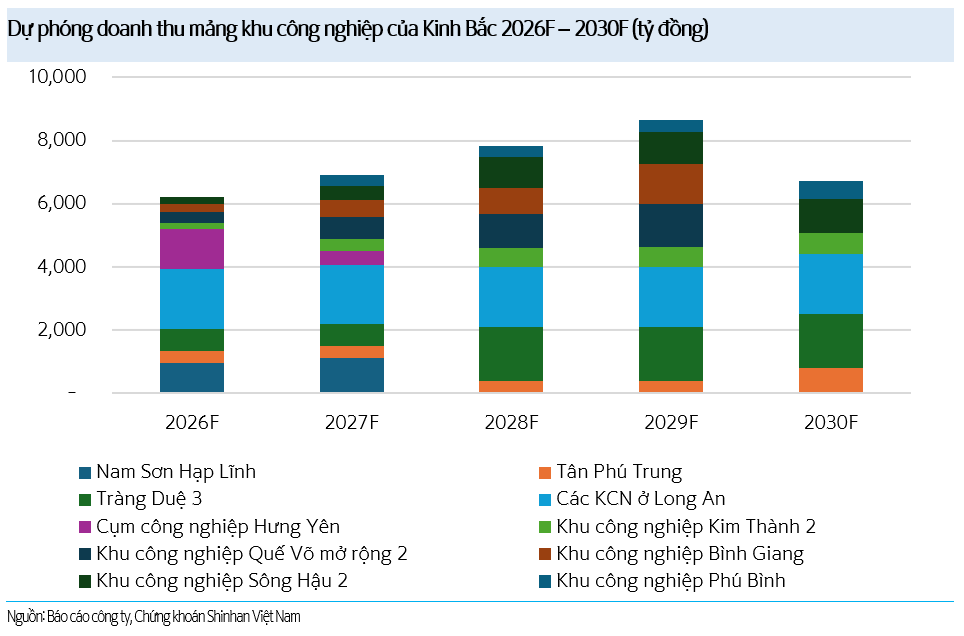 Chúng tôi kỳ vọng hoạt động cho thuê đất sẽ tiếp tục tăng trưởng trong năm 2026 khi các dự án trọng điểm như KCN Tràng Duệ 3 và KĐT Tràng Cát bắt đầu đưa vào khai thác và ghi nhận doanh thu. Bên cạnh đó hàng loạt dự án được cấp phép trong năm 2025 như: KCN Kim Thành 2 (234 ha), KCN Quế Võ 2 mở rộng (140 ha), KCN Sông Hậu 2 (380 ha) và KCN Phú Bình (675 ha),… được kỳ vọng sẽ đóng góp doanh thu cho KBC.