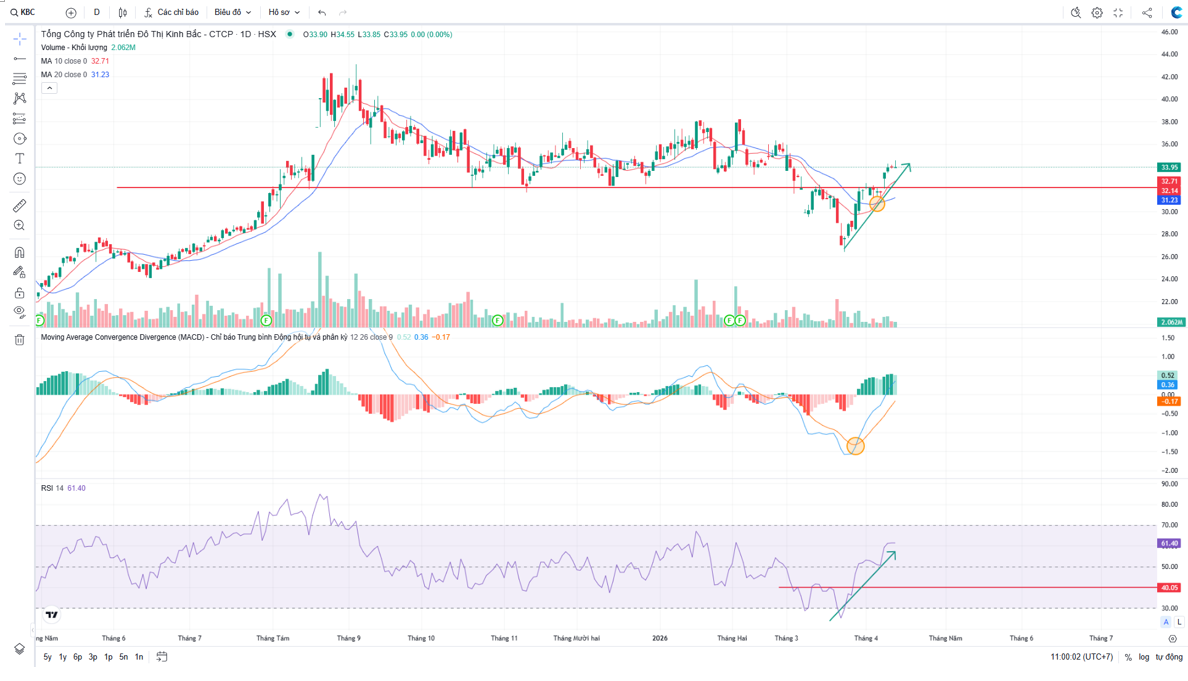 Phân tích kỹ thuật cho thấy cổ phiếu đã tạo đáy thành công, giá đã phá vỡ vùng kháng cự quan trọng, và cắt lên trên đường MA10 và MA20. Đường MA10 cũng cắt lên đường MA20 cũng cố quan điểm hồi phục. Các chỉ báo MACD và RSI đồng thời xác nhận việc tạo đáy và bắt đầu xu hướng tăng ngắn hạn.