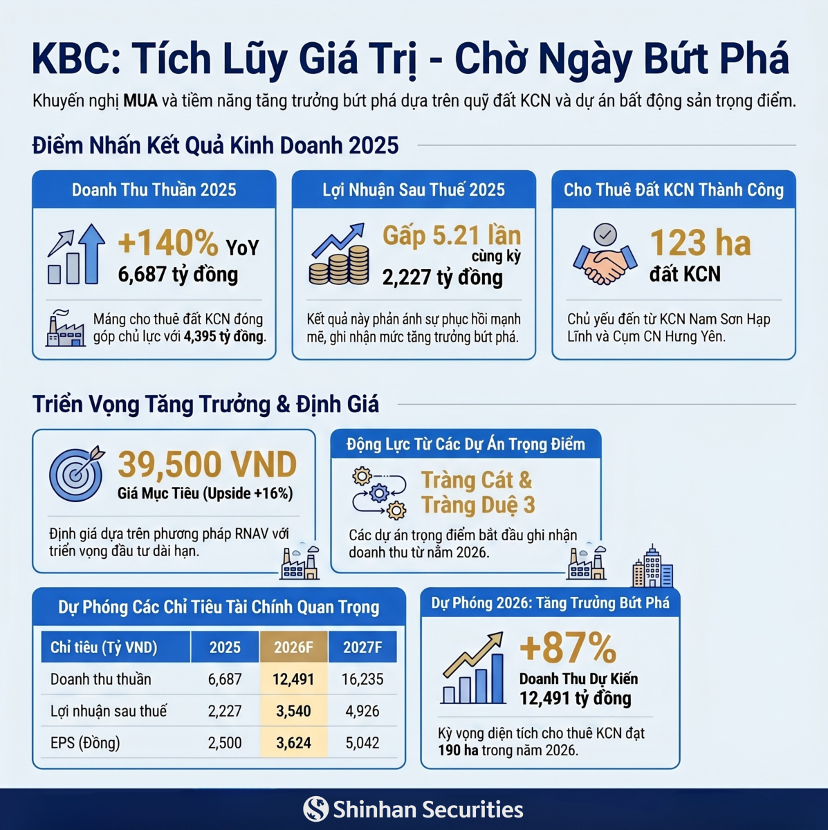 Chúng tôi ước tính: (1) Diện tích đất cho thuê KCN sẽ đạt khoảng 190 ha trong năm 2026 và 220 ha trong năm 2027. Doanh thu KBC kỳ vọng đạt khoảng VND 12,491 tỷ (+87% YoY) trong năm 2026 và VND 16,235 tỷ (+30% YoY) trong năm 2027. Lợi nhuận sau thuế năm 2026 dự kiến đạt VND 3,540 tỷ (+59% YoY) và lợi nhuận sau thuế năm 2027 dự kiến đạt VND 4,926 tỷ (+39% YoY).