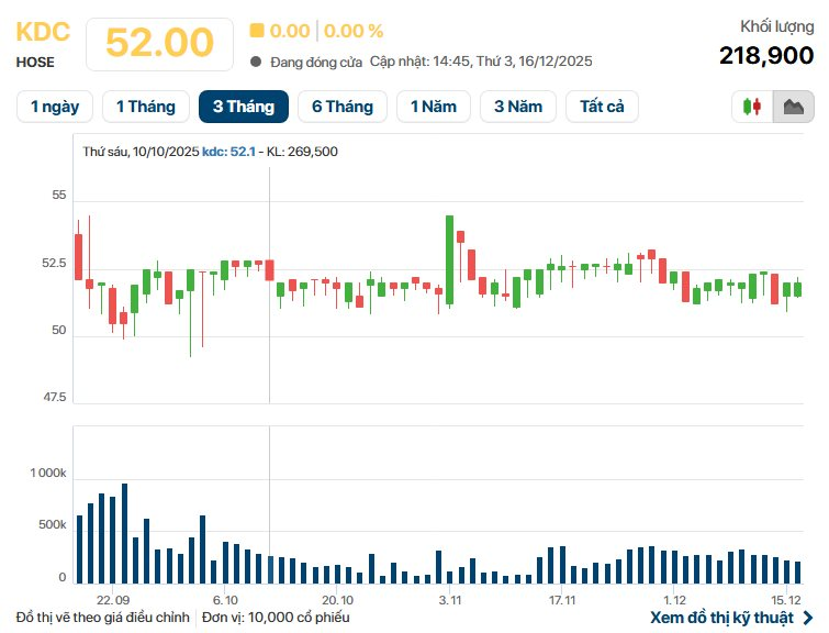 Trên thị trường chứng khoán, đóng cửa phiên giao dịch ngày 16/12, cổ phiếu KDC ghi nhận mức giá 52.000 đồng/cp.