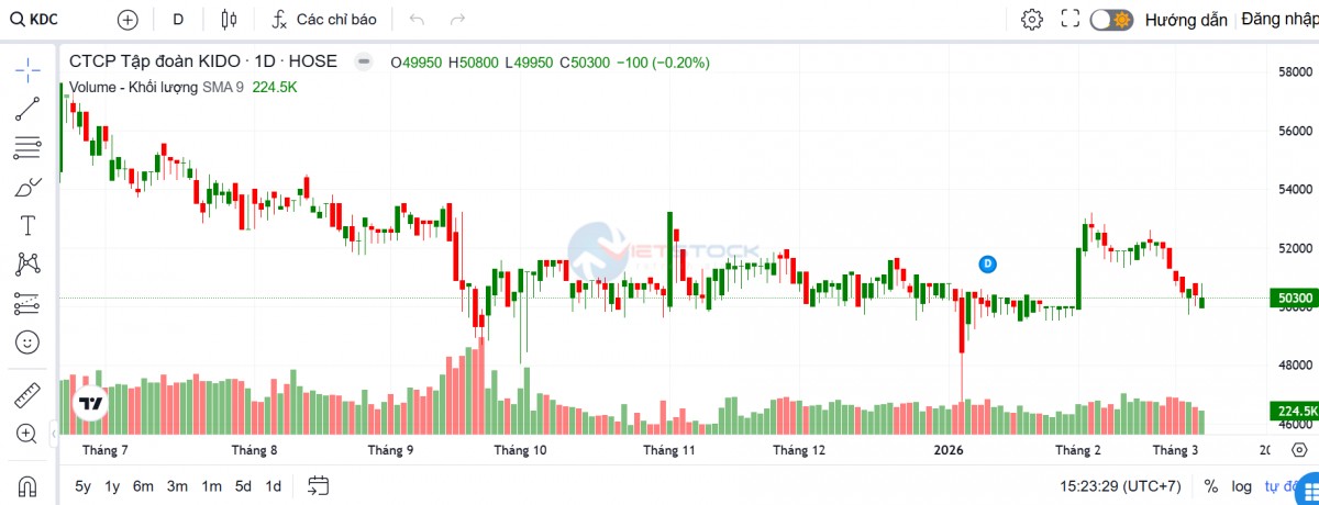 Trên thị trường chứng khoán, chốt phiên giao dịch ngày 6/3, cổ phiếu KDC ở mức 50.300 đồng/cp, giảm nhẹ 100 đồng so với phiên trước, tương ứng mức giảm 0,2%. Thanh khoản đạt hơn 224.000 cổ phiếu, thấp hơn đáng kể so với các phiên gần đây khi khối lượng giao dịch liên tục duy trì quanh vùng 260.000 – 350.000 cổ phiếu. Tạm tính theo mức giá này, Kido sẽ phải chi khoảng 750 tỷ đồng nếu mua lại tối đa số cổ phiếu dự kiến.