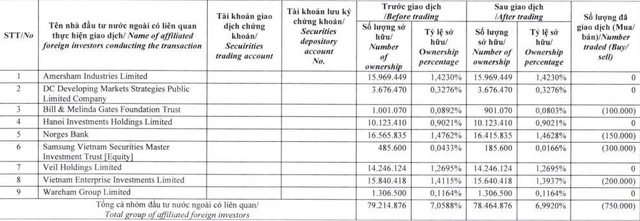 Cụ thể, quỹ thành viên Bill & Melinda Gates Foundation Trust bán 100.000 cổ phiếu KDH; quỹ Norges Bank bán 150.000 cổ phiếu; quỹ Samsung Vietnam Securities Master Investment Trust [Equity] bán 300.000 cổ phiếu và quỹ Vietnam Enterprise Investments Limited bán 200.000 cổ phiếu.