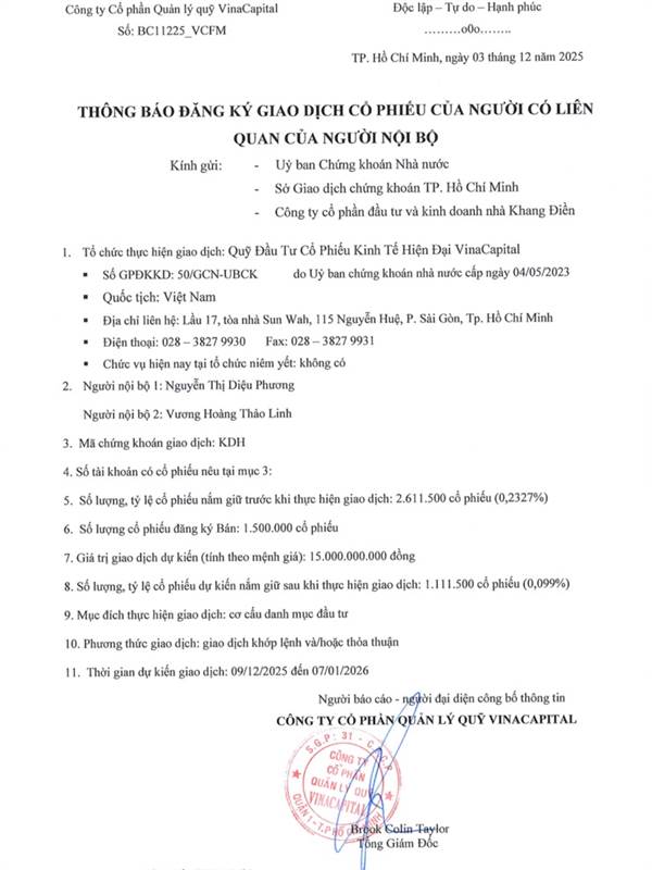 Quỹ đầu tư cổ phiếu Kinh tế hiện đại VinaCapital, Quỹ đầu tư cổ phiếu Tiếp cận thị trường VinaCapital thông báo giao dịch cổ phiếu của tổ chức có liên quan của Người nội bộ Công ty Cổ phần Đầu tư và Kinh doanh nhà Khang Điền như sau: