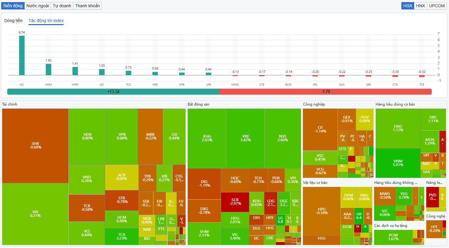 Ngược lại, nhóm tài chính, ngân hàng và bảo hiểm phân hóa mạnh. Nhiều cổ phiếu chứng khoán thu hẹp đà tăng, còn các mã ngân hàng và bảo hiểm như VCB, CTG, MBB, STB, SHB, EIB, BVH và BMI giảm.