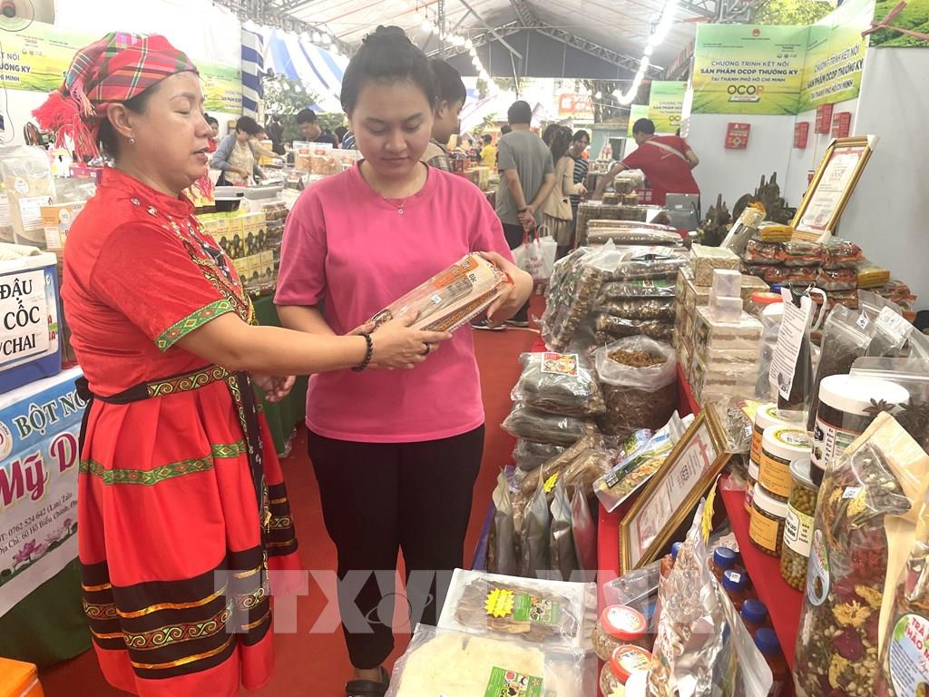 Đặc sản vùng cao thu hút người tiêu dùng tại Hội chợ OCOP. Ảnh: Hương Giang - TTXVN
