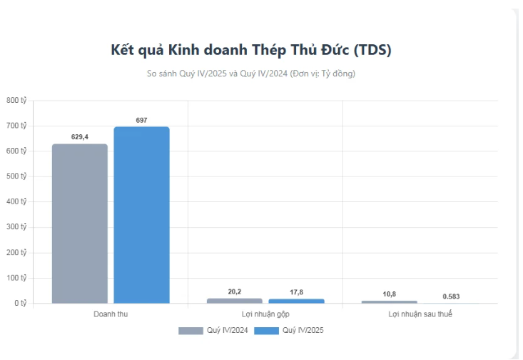 Trong khi đó, Công ty CP Thép Thủ Đức – VNSTEEL (UPCOM: TDS), doanh thu Quý IV/2025 còn tăng tới 61,6% so với cùng kỳ năm 2024, tương ứng tăng 264 tỷ đồng. Tuy nhiên mức này không đuổi kịp giá vốn với tốc độ tăng 65,2%, tương ứng tăng 267 tỷ đồng.