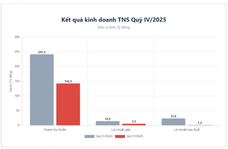 Kết quả, TNS ghi nhận vỏn vẹn gần 1,2 tỷ đồng lãi sau thuế, giảm 22,4 tỷ đồng, tương ứng giảm 94,9% so với Quý IV/2024. Bên cạnh đó, trong kỳ Công ty chưa đạt được thỏa thuận về điều kiện thanh toán, do đó chi phí lãi vay chưa giảm so với cùng kỳ năm trước.