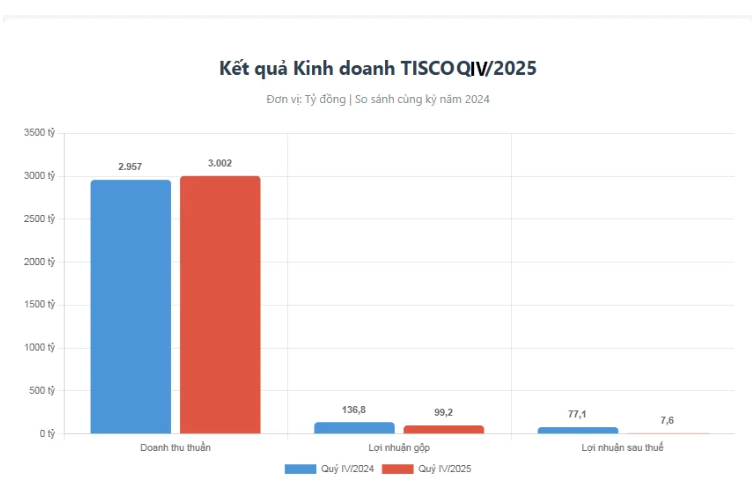 Tại Báo cáo tài chính hợp nhất Quý IV/2025 của Công ty CP Gang thép Thái Nguyên (TISCO) (UPCOM: TIS), doanh thu thuần trong kỳ ghi nhận mức hơn 3.002 tỷ đồng, gần như đi ngang so với mức 2.957 tỷ đồng cùng kỳ năm trước. Giá vốn hàng bán trong kỳ chiếm tới 96,6% doanh thu thuần (kỳ trước là 95,3%). Lãi gộp của TISCO còn 99,2 tỷ đồng, giảm 27,5% so với Quý IV/2024.