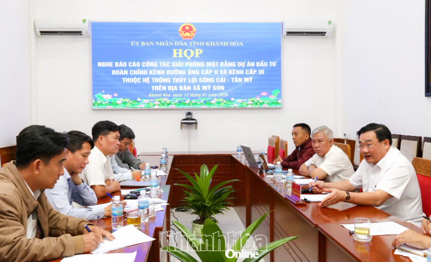 Sáng 12-1, đồng chí Trịnh Minh Hoàng - Phó Chủ tịch UBND tỉnh Khánh Hòa chủ trì cuộc họp với các đơn vị, địa phương nghe báo cáo công tác giải phóng mặt bằng Dự án đầu tư hoàn chỉnh kênh đường ống cấp II và kênh cấp III thuộc hệ thống thủy lợi Sông Cái - Tân Mỹ trên địa bàn xã Mỹ Sơn.