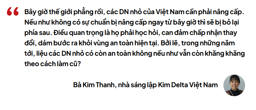 "Bây giờ thế giới phẳng rồi, các DN nhỏ của Việt Nam cần phải nâng cấp. Nếu như không có sự chuẩn bị nâng cấp ngay từ bây giờ thì sẽ bị bỏ lại phía sau. Điều quan trọng là họ phải học hỏi, can đảm chấp nhận thay đổi, dám bước ra khỏi vùng an toàn hiện tại. Bởi lẽ, trong những năm tới, liệu các DN nhỏ có còn an toàn không nếu như vẫn còn khăng khăng theo cách làm cũ?", bà Thanh lưu ý.