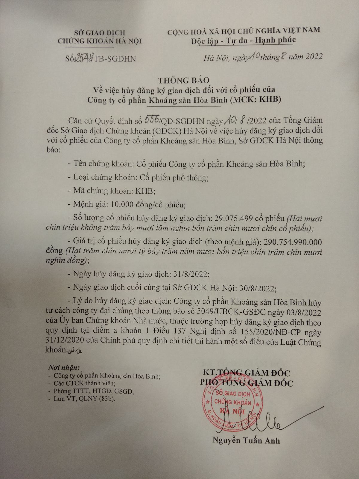 KHB: Ngày 31/08/2022, ngày hủy ĐKGD cổ phiếu của CTCP Khoáng sản Hòa Bình
