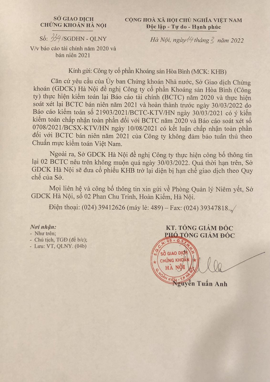 Sở GDCK Hà Nội đề nghị Công ty thực hiện công bố thông tin lại 02 BCTC nêu trên không muộn quá ngày 30/03/2022. Quá thời hạn trên, Sở GDCK Hà Nội sẽ đưa cổ phiếu KHB vào diện bị hạn chế giao dịch theo Quy chế của Sở